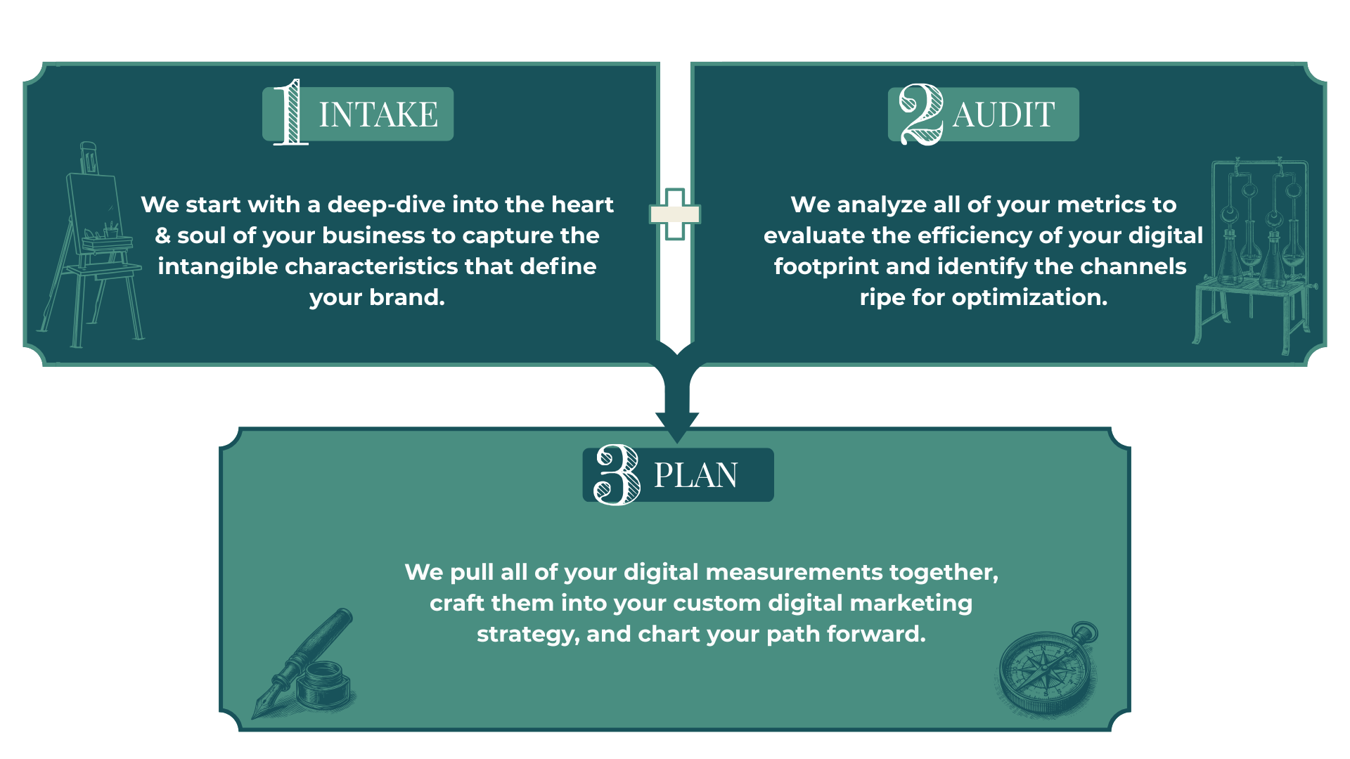 Our process is meticulously honed from years of navigating the intricate layers of the digital landscape and helping business owners cut through the noise. The result is a 3-step method that begins with the two most informative measurements of your business that are then used to create a custom plan, blending real-world patterns with authentic brand stories.